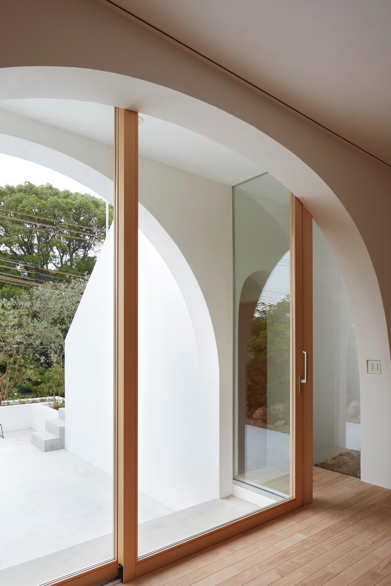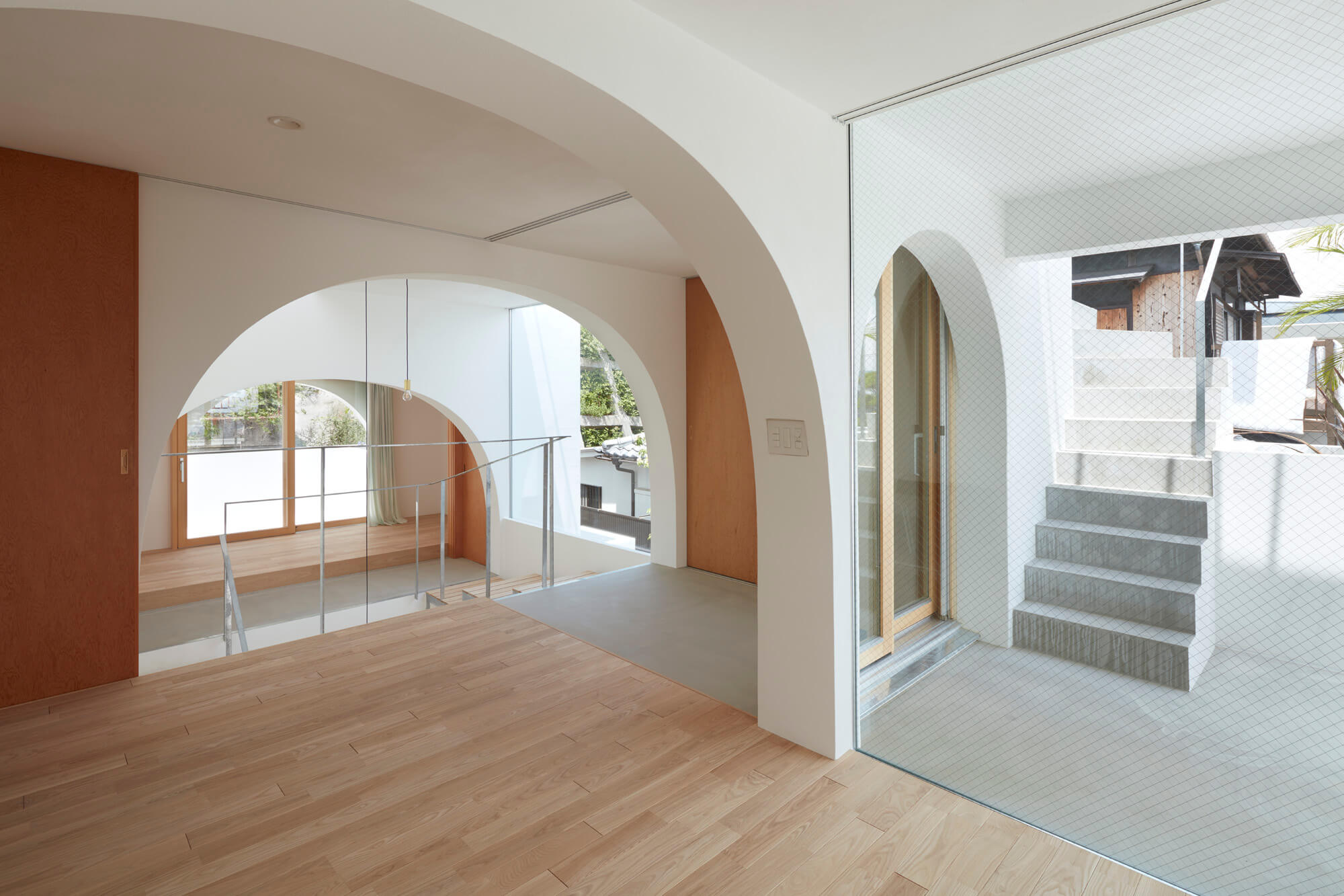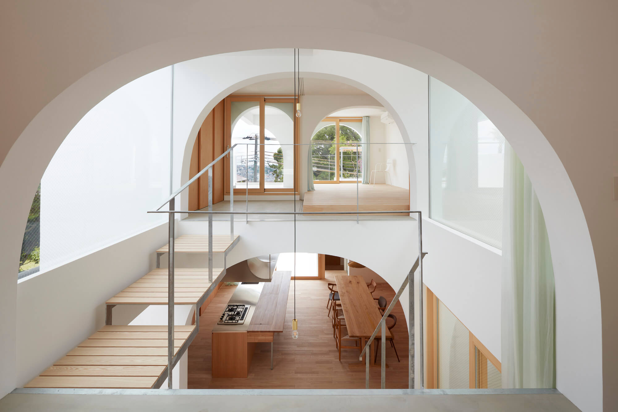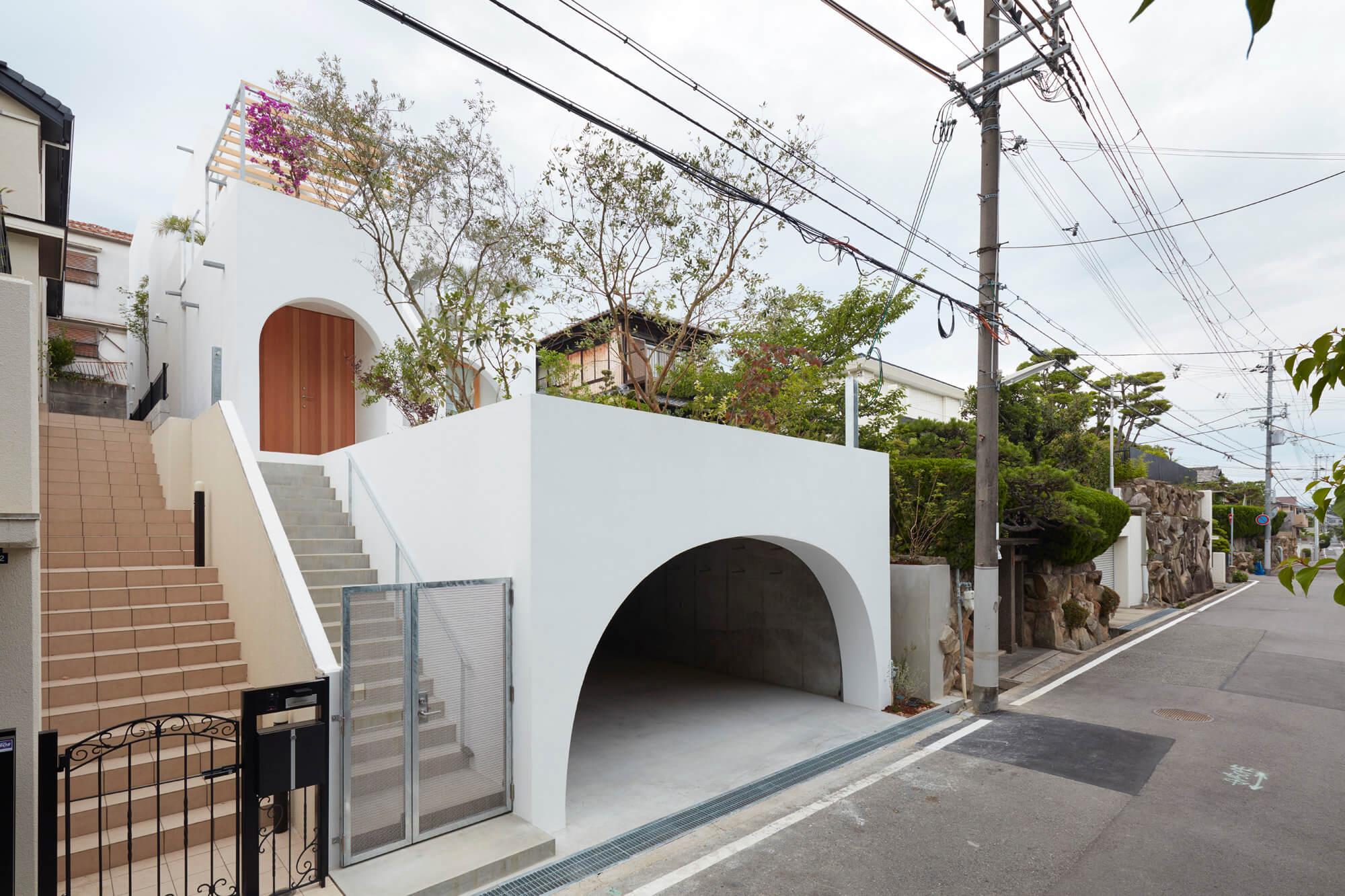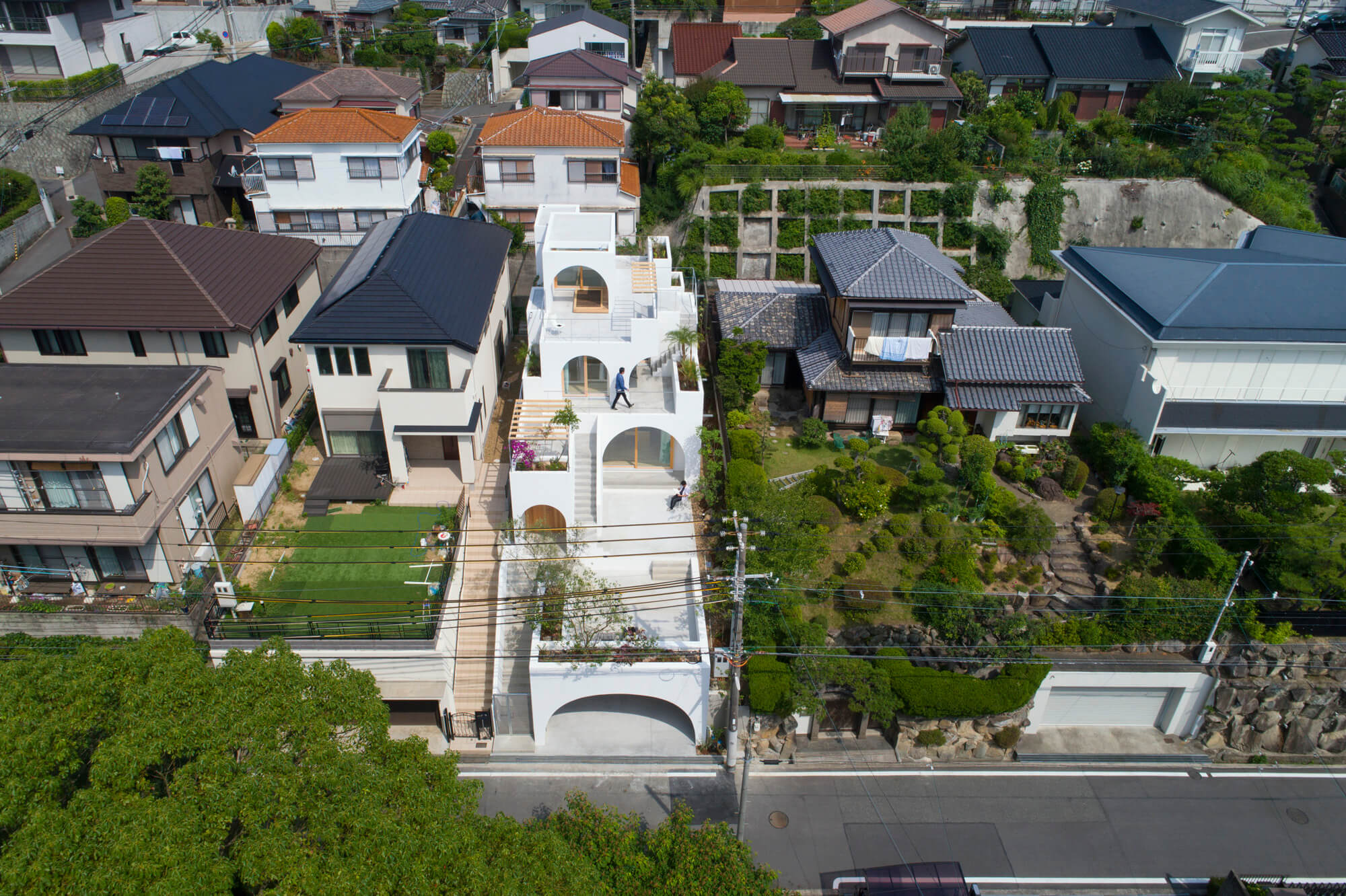 敷地は神戸の傾斜地に位置する典型的なひな壇造成地。削られてしまった斜面を今一度回復する、地形を復元するような空間構成とし、採光や通風といった自然環境を無理なく享受し、周囲にも受けながす建築であること、また元々の斜面を復元するような建築の表皮がそのまま内部と連続する豊かな外部空間として機能し、内外を行き来しながら、文字通り斜面に住むことができる建築を目指した。そのような空間構成を得るにあたり問題となったのは、階を跨いで如何に自由に空間を積層できるか、上下階のずれを如何に調停可能かという単純な問であった。上下階で構造がずれる計画をうまく調停するものとして、アーチの積層による壁を考案し、ピラミッド状に力を上から下に受けながすこととした。 手前から奥に向けて変化する空間構成に応じて変容する、まるでロマネスクのファサードのような壁をつないでゆくことにより、 力学に逆らわず、しかしながら自由な空間のスタッキングを可能とする建築に結実したのではないかと考えている。