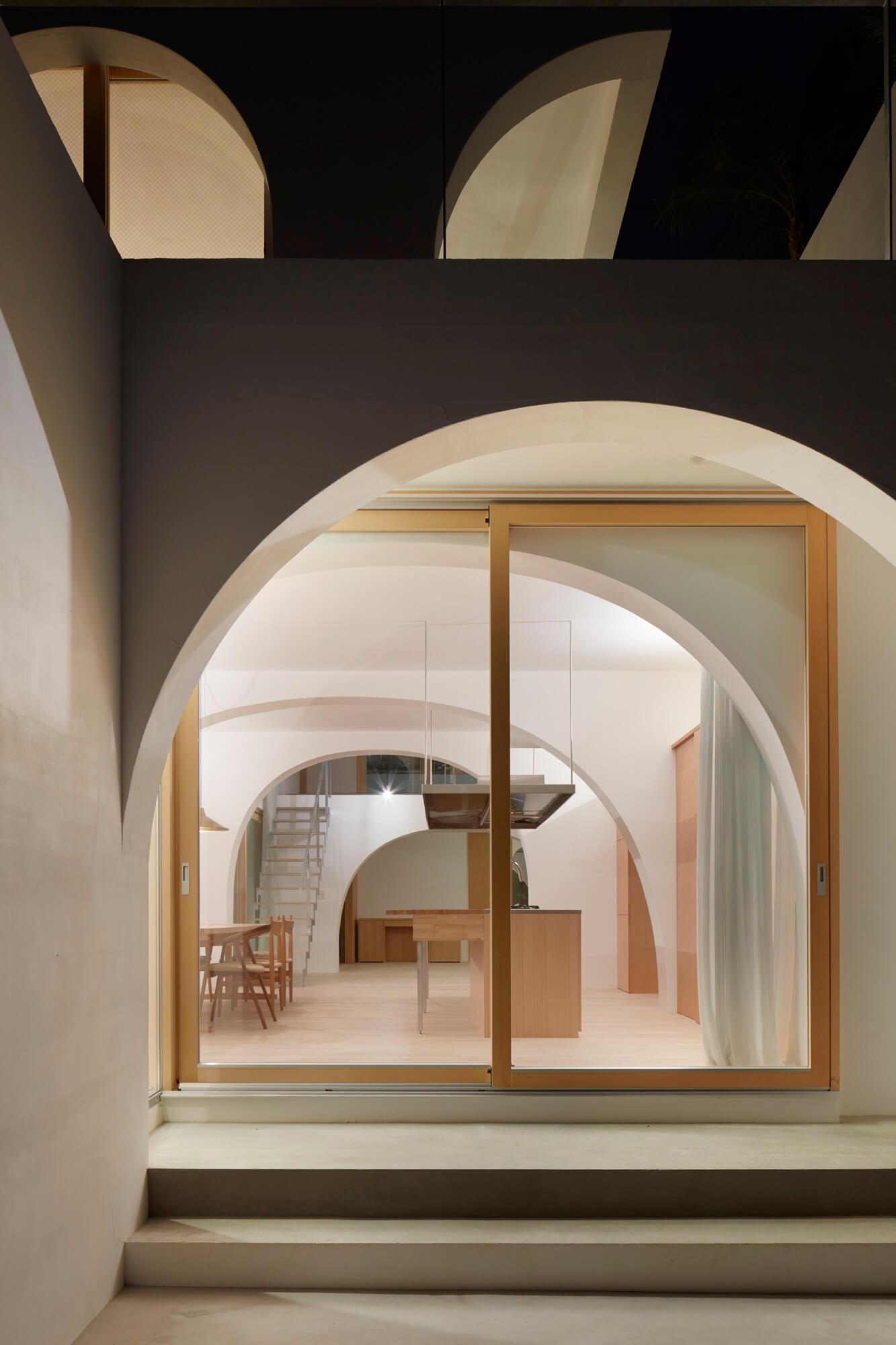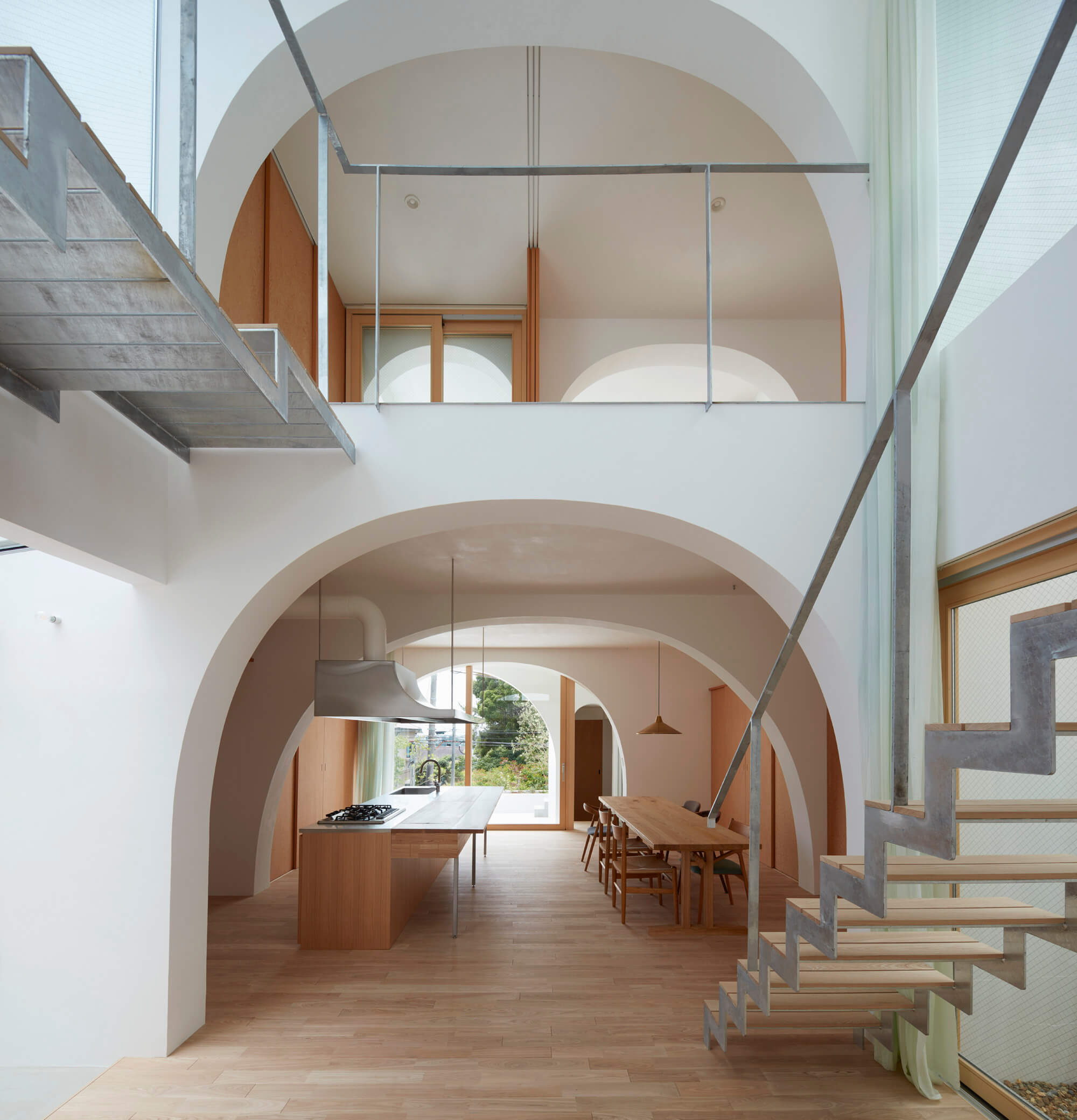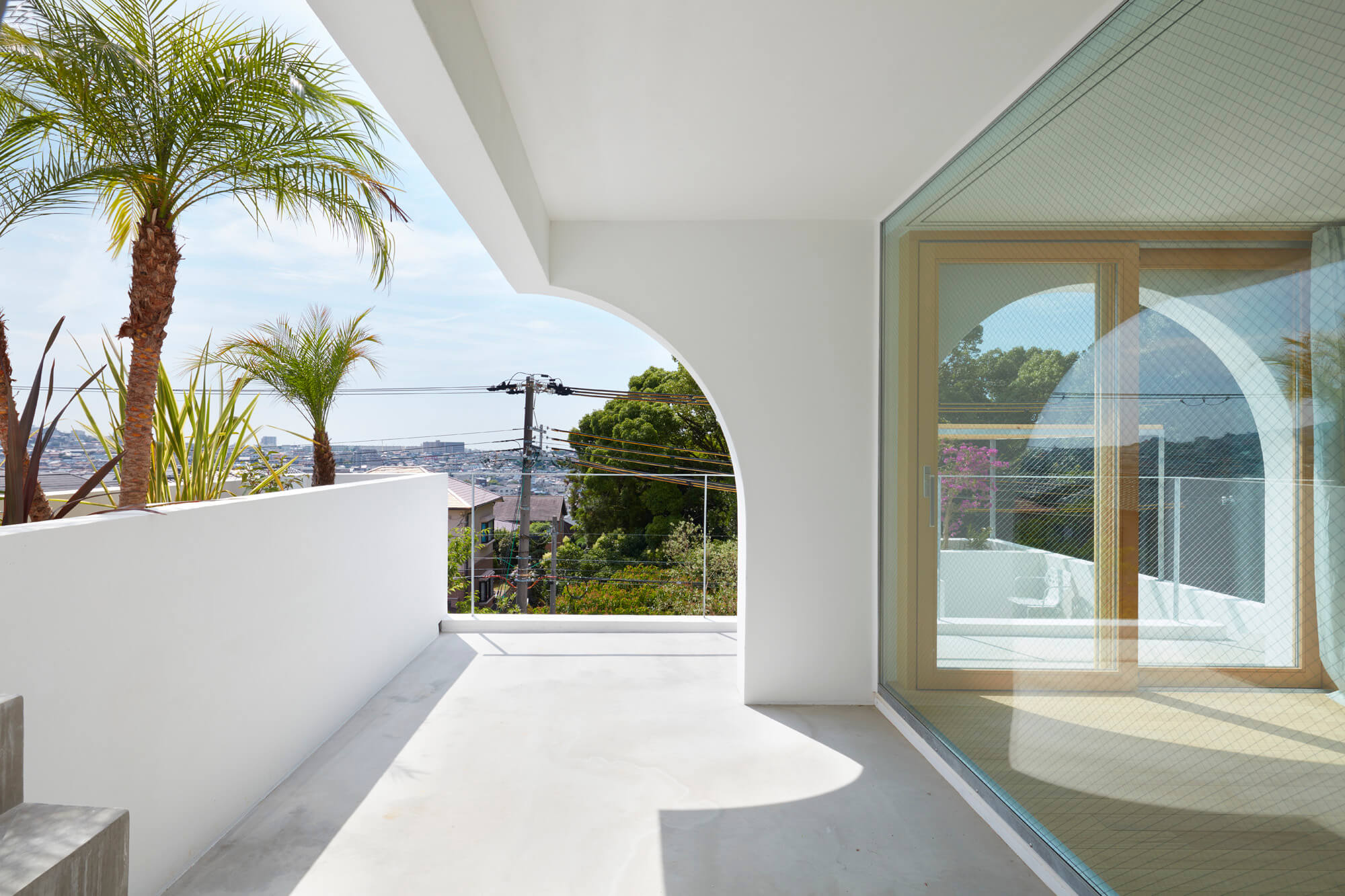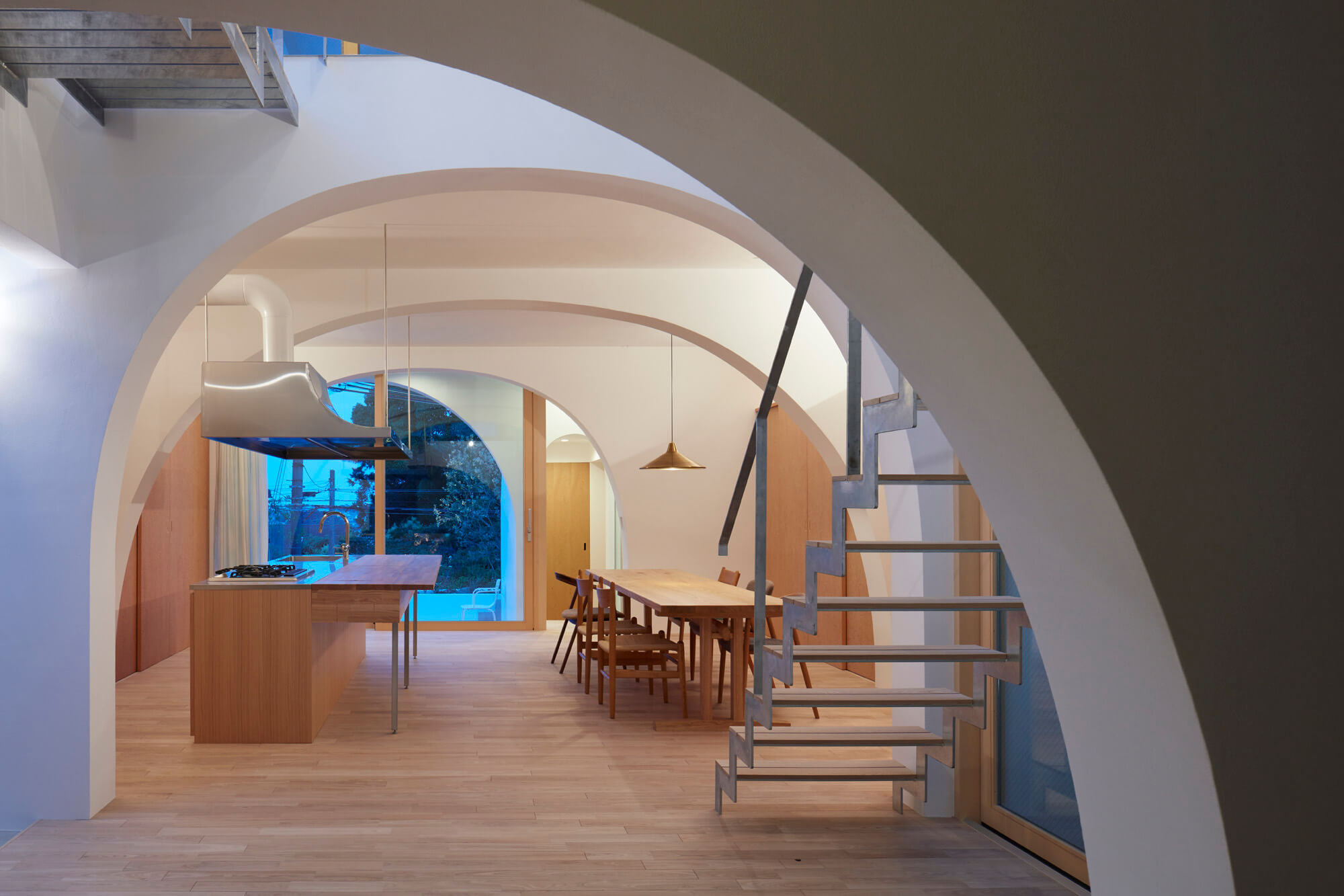 敷地は神戸の傾斜地に位置する典型的なひな壇造成地。削られてしまった斜面を今一度回復する、地形を復元するような空間構成とし、採光や通風といった自然環境を無理なく享受し、周囲にも受けながす建築であること、また元々の斜面を復元するような建築の表皮がそのまま内部と連続する豊かな外部空間として機能し、内外を行き来しながら、文字通り斜面に住むことができる建築を目指した。そのような空間構成を得るにあたり問題となったのは、階を跨いで如何に自由に空間を積層できるか、上下階のずれを如何に調停可能かという単純な問であった。上下階で構造がずれる計画をうまく調停するものとして、アーチの積層による壁を考案し、ピラミッド状に力を上から下に受けながすこととした。 手前から奥に向けて変化する空間構成に応じて変容する、まるでロマネスクのファサードのような壁をつないでゆくことにより、 力学に逆らわず、しかしながら自由な空間のスタッキングを可能とする建築に結実したのではないかと考えている。
