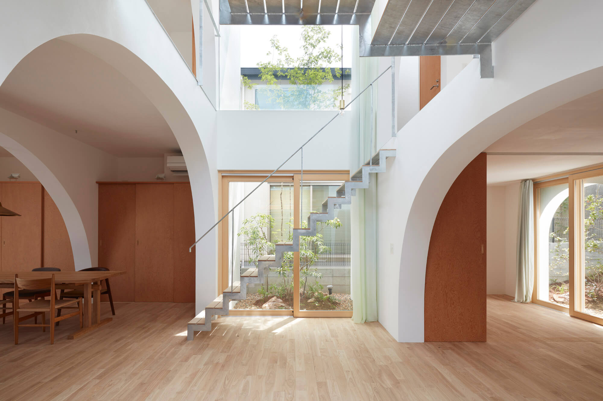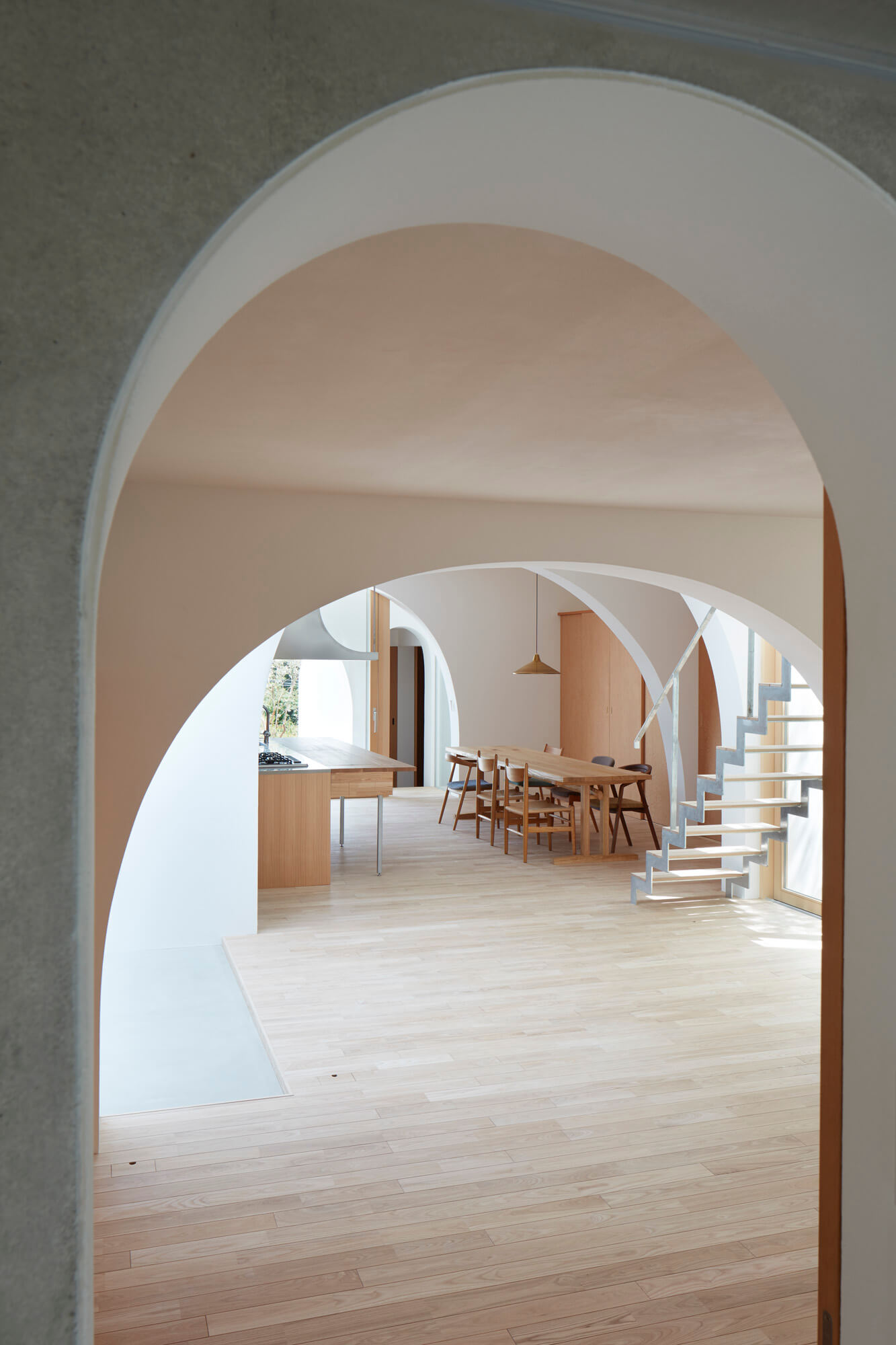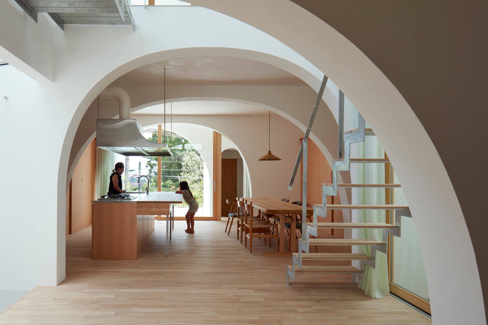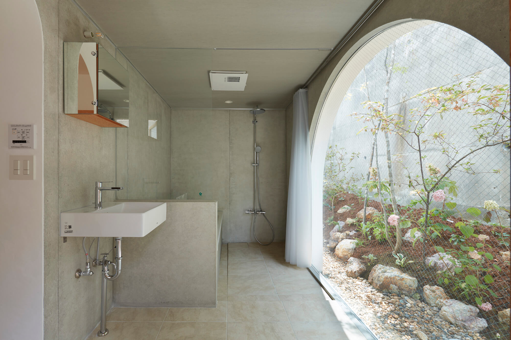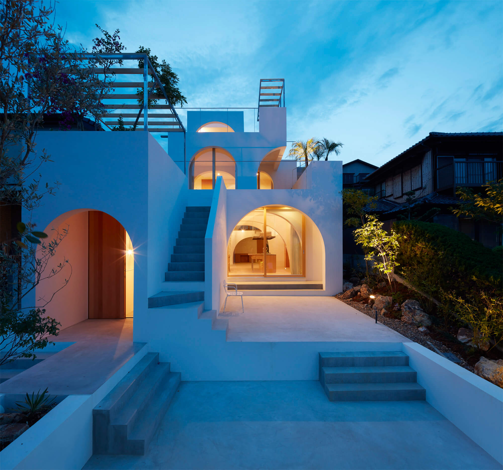 敷地は神戸の傾斜地に位置する典型的なひな壇造成地。削られてしまった斜面を今一度回復する、地形を復元するような空間構成とし、採光や通風といった自然環境を無理なく享受し、周囲にも受けながす建築であること、また元々の斜面を復元するような建築の表皮がそのまま内部と連続する豊かな外部空間として機能し、内外を行き来しながら、文字通り斜面に住むことができる建築を目指した。そのような空間構成を得るにあたり問題となったのは、階を跨いで如何に自由に空間を積層できるか、上下階のずれを如何に調停可能かという単純な問であった。上下階で構造がずれる計画をうまく調停するものとして、アーチの積層による壁を考案し、ピラミッド状に力を上から下に受けながすこととした。 手前から奥に向けて変化する空間構成に応じて変容する、まるでロマネスクのファサードのような壁をつないでゆくことにより、 力学に逆らわず、しかしながら自由な空間のスタッキングを可能とする建築に結実したのではないかと考えている。