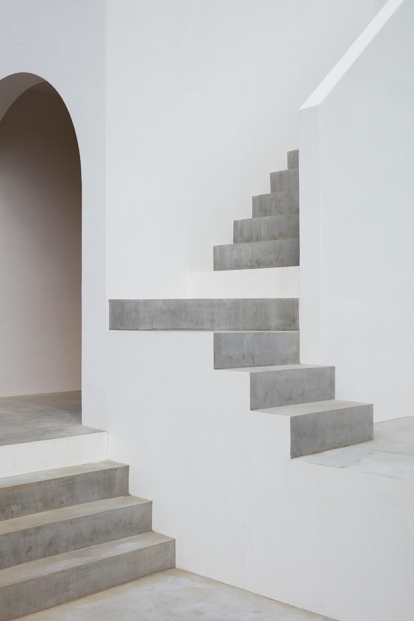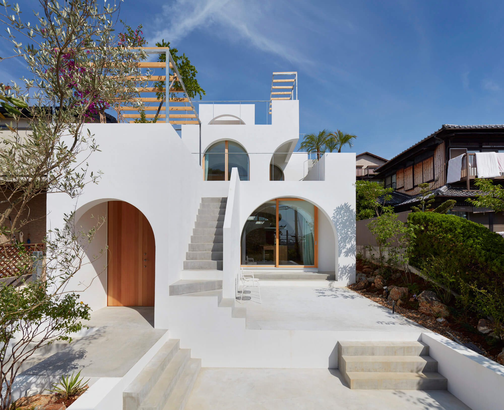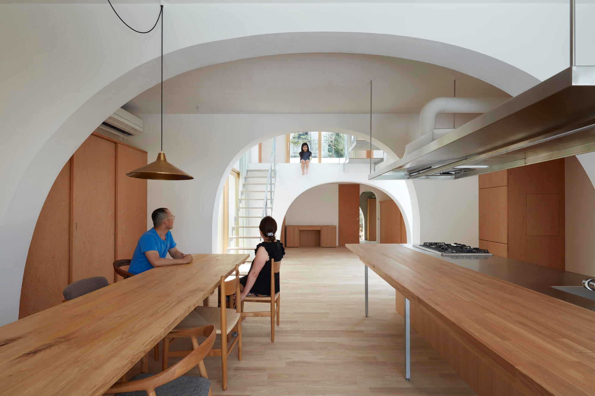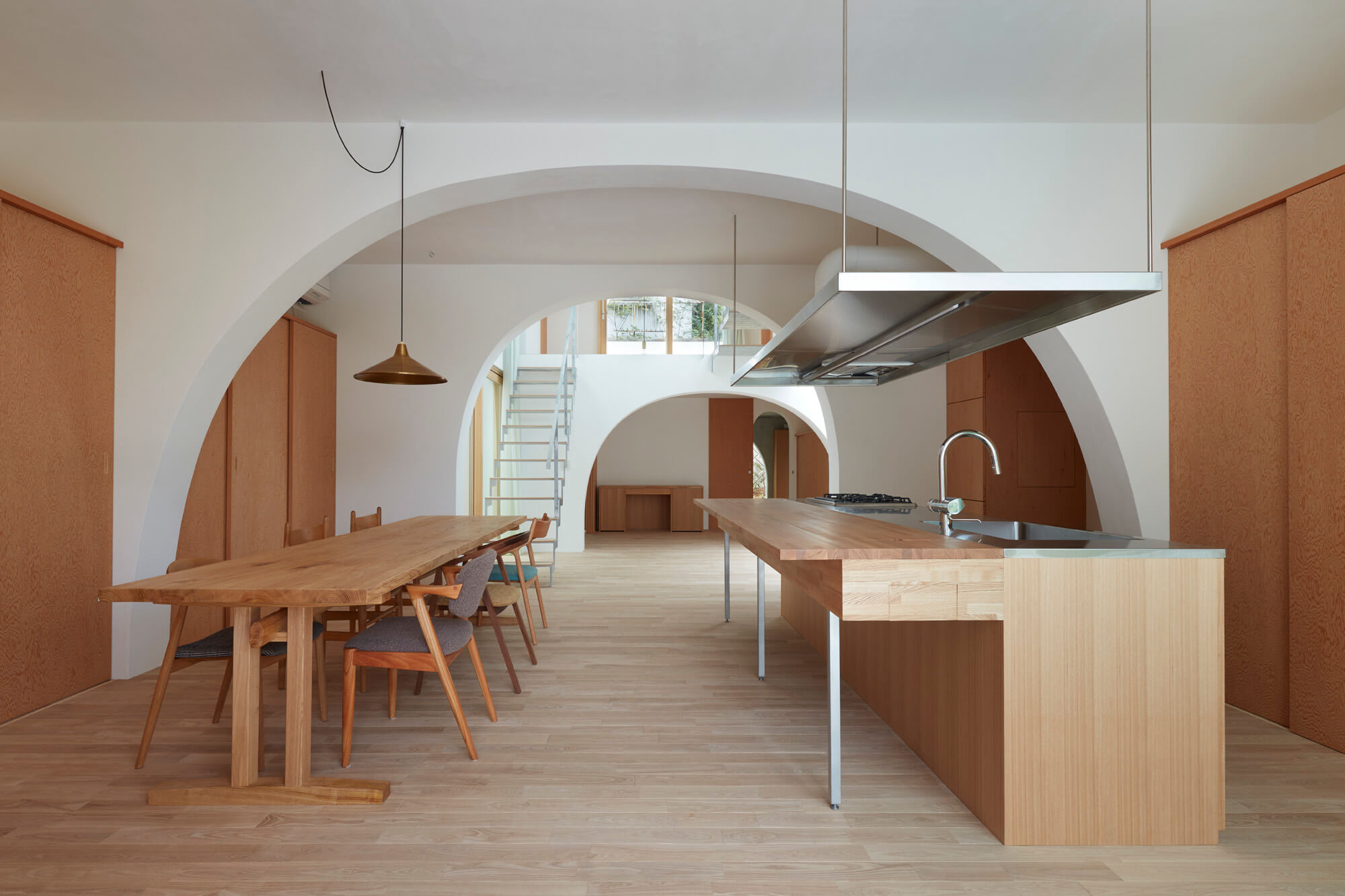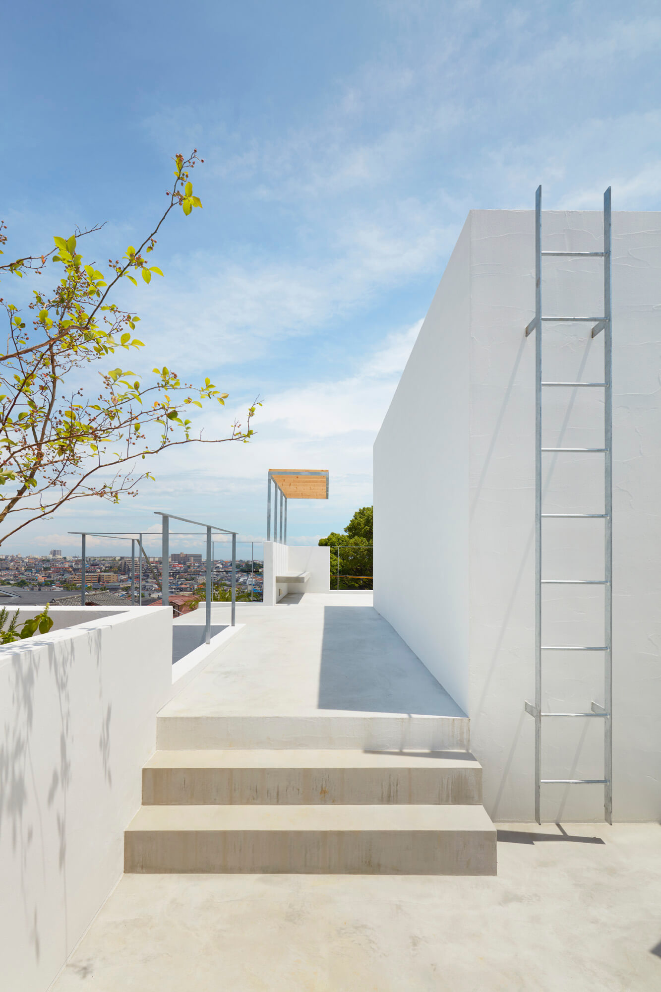 敷地は神戸の傾斜地に位置する典型的なひな壇造成地。削られてしまった斜面を今一度回復する、地形を復元するような空間構成とし、採光や通風といった自然環境を無理なく享受し、周囲にも受けながす建築であること、また元々の斜面を復元するような建築の表皮がそのまま内部と連続する豊かな外部空間として機能し、内外を行き来しながら、文字通り斜面に住むことができる建築を目指した。そのような空間構成を得るにあたり問題となったのは、階を跨いで如何に自由に空間を積層できるか、上下階のずれを如何に調停可能かという単純な問であった。上下階で構造がずれる計画をうまく調停するものとして、アーチの積層による壁を考案し、ピラミッド状に力を上から下に受けながすこととした。 手前から奥に向けて変化する空間構成に応じて変容する、まるでロマネスクのファサードのような壁をつないでゆくことにより、 力学に逆らわず、しかしながら自由な空間のスタッキングを可能とする建築に結実したのではないかと考えている。